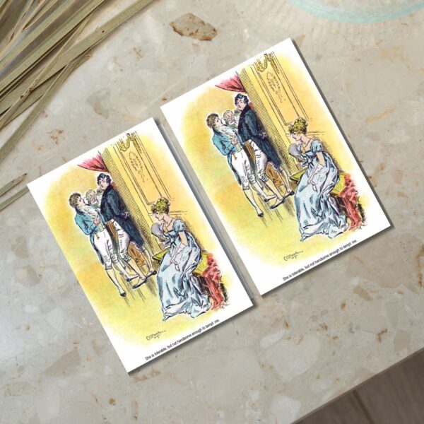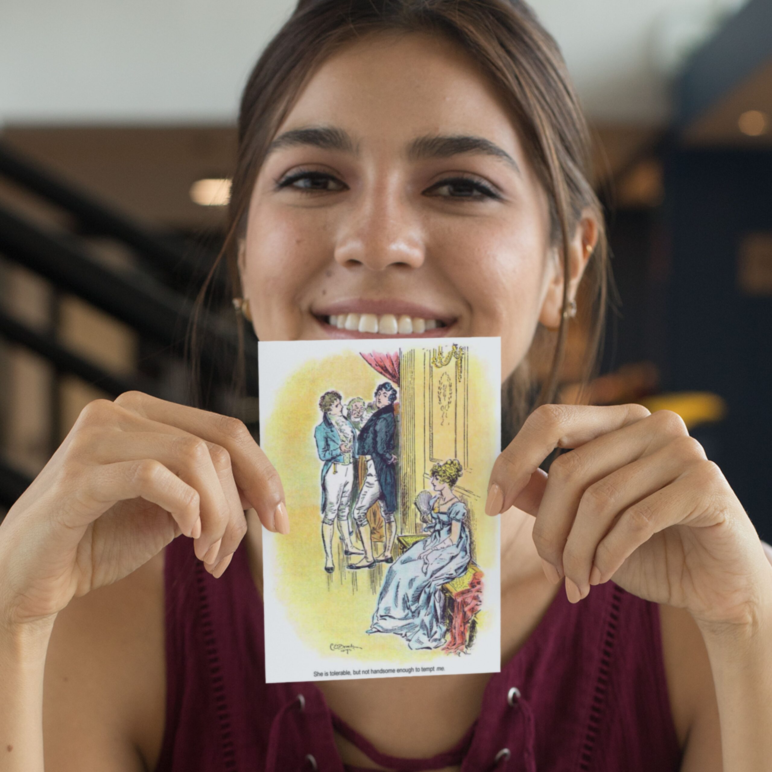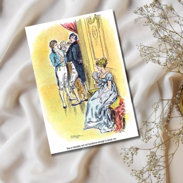 Tap into the Regency era by sending a message through the post with this Jane Austen Pride and Prejudice Postcard featuring Mr. Darcy, Elizabeth Bennet, and Mr. Bingley, “She is Tolerable”. This illustration was created by C. E. Brock for the 1895 print edition of Jane Austen’s novel Pride and Prejudice.