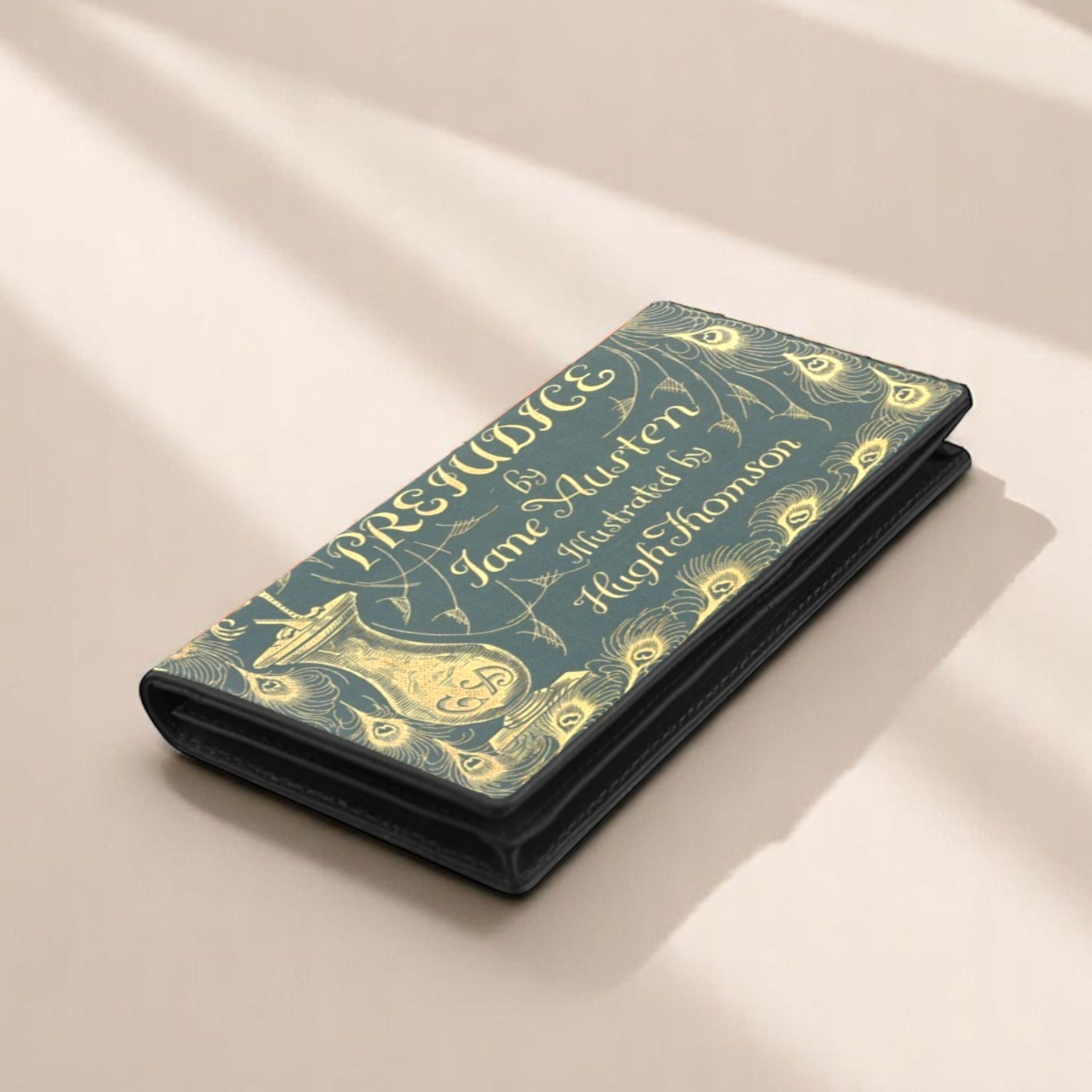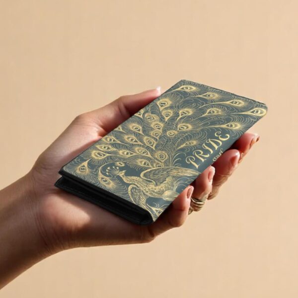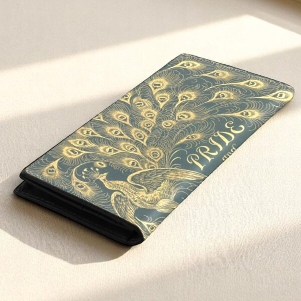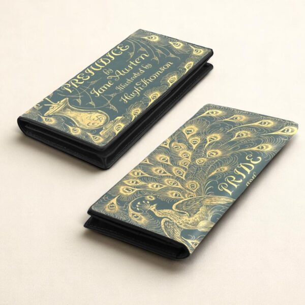 A Genuine Leather Wallet adorned with the artistry of Hugh Thomson from the 1894 Peacock Edition of “Pride and Prejudice.” This stylish repository of your treasures boasts a generous 11 credit card slots, a clear window, and three pockets for your precious funds. With the charm of a magnetic snap closure, it secures your valuables with an air of Regency-era grace.