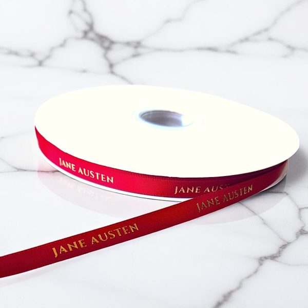 Design: Red Ribbon contains repeating text “Jane Austen” with Gold Foil