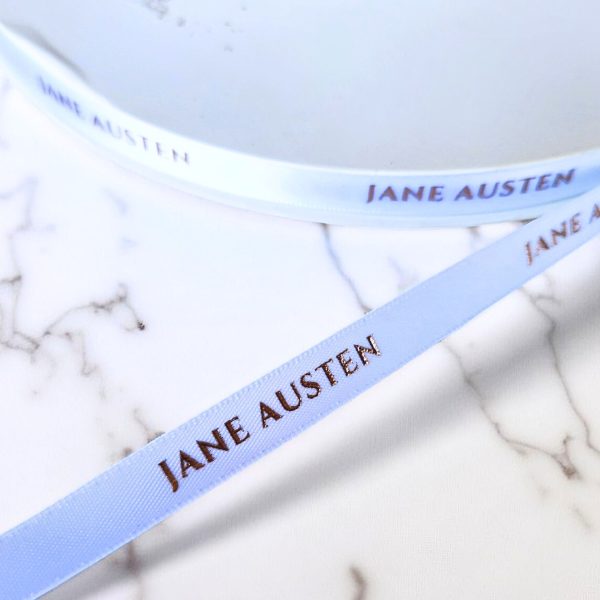 Design: White Ribbon contains repeating text “Jane Austen” with Rose Gold Foil