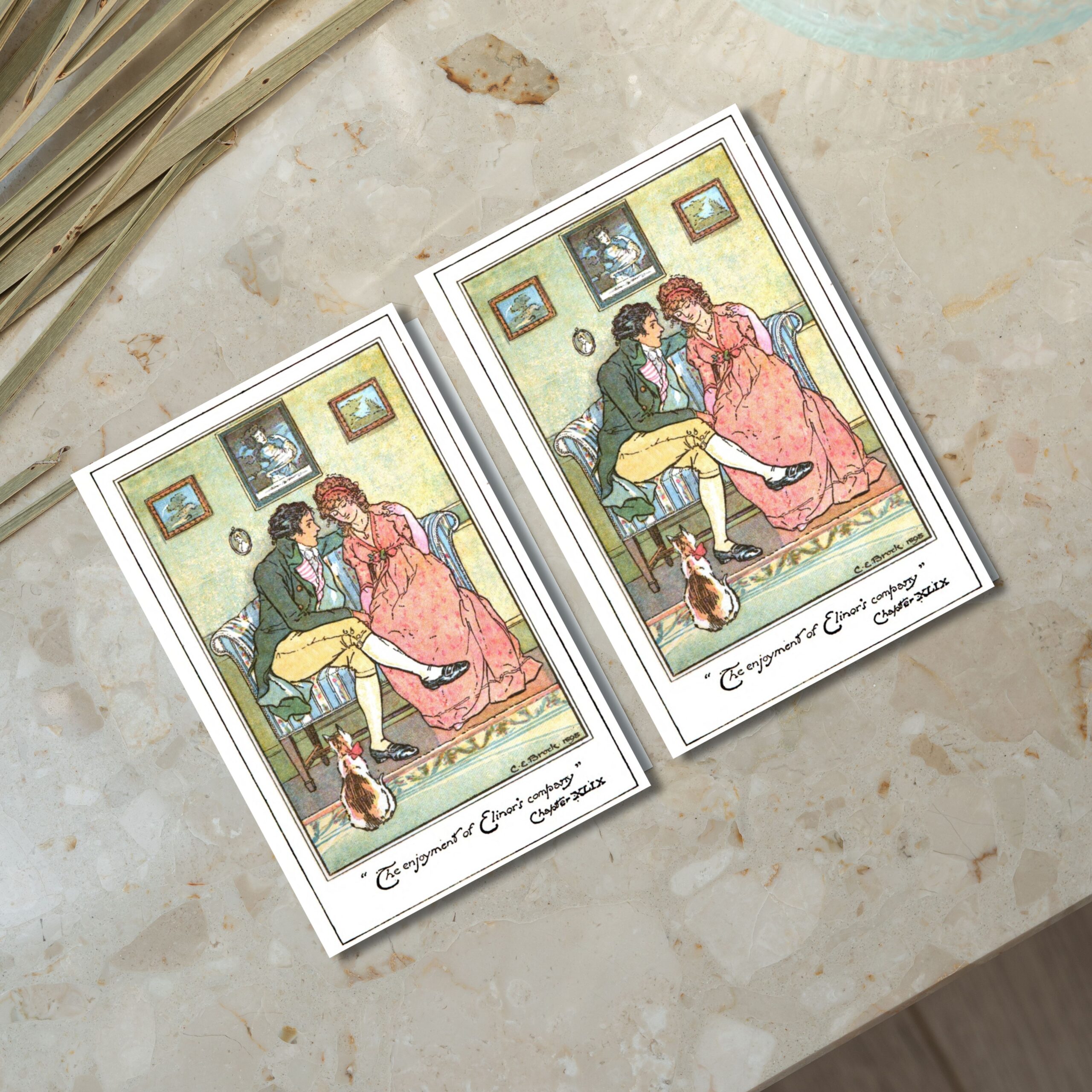 Send a postcard and brighten someone’s day. This Sense and Sensibility 1898 Illustration by C.E. Brock is printed on a quality postcard, with a UV finish. Postcard features Edward and Elinor, “The enjoyment of Elinor’s company.”